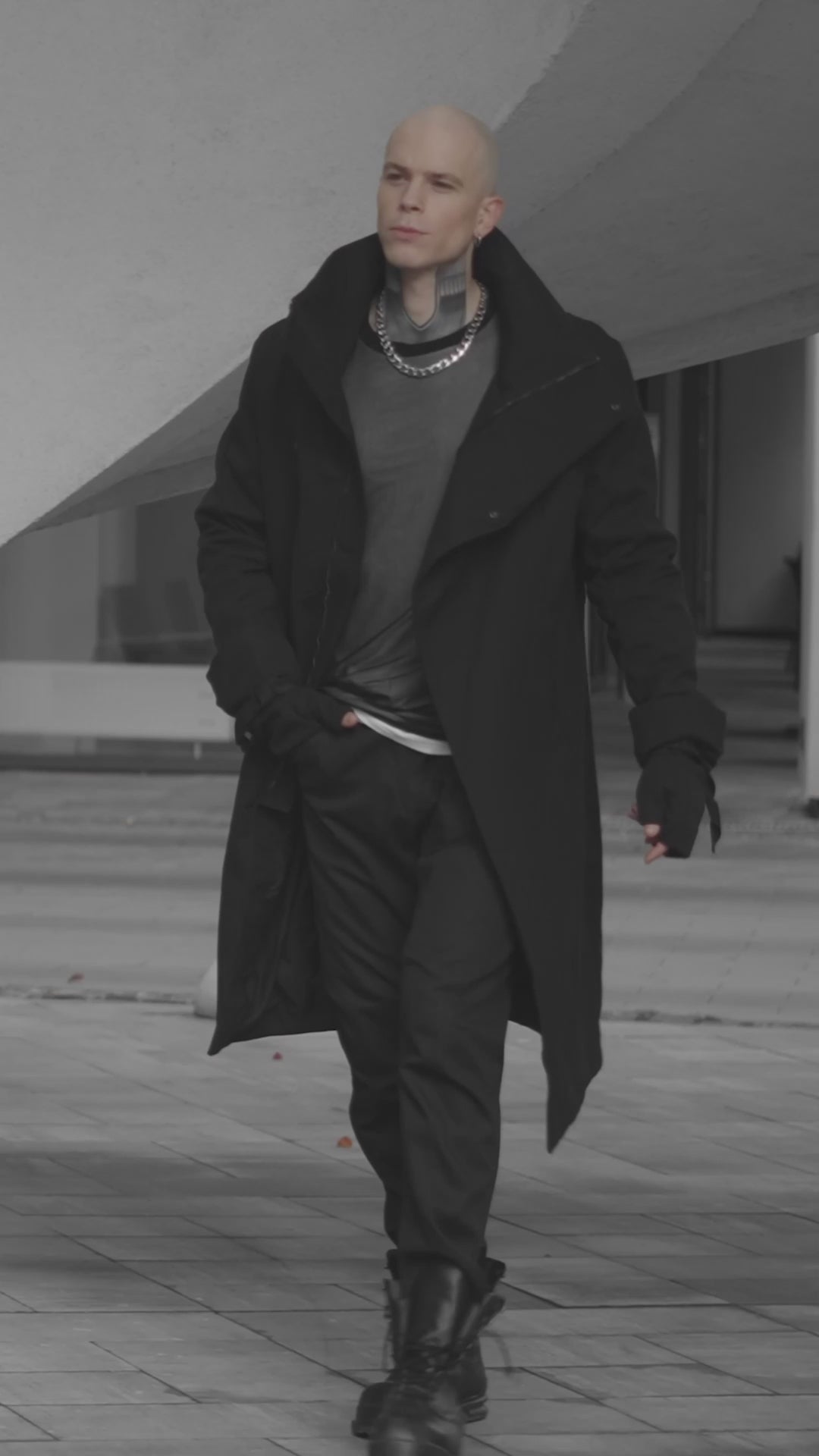 Presenting a polished version of the asymmetrical top layer style, the coat features an asymmetric front zipper at jacket length that creates the funnel neck when zipped all the way up.