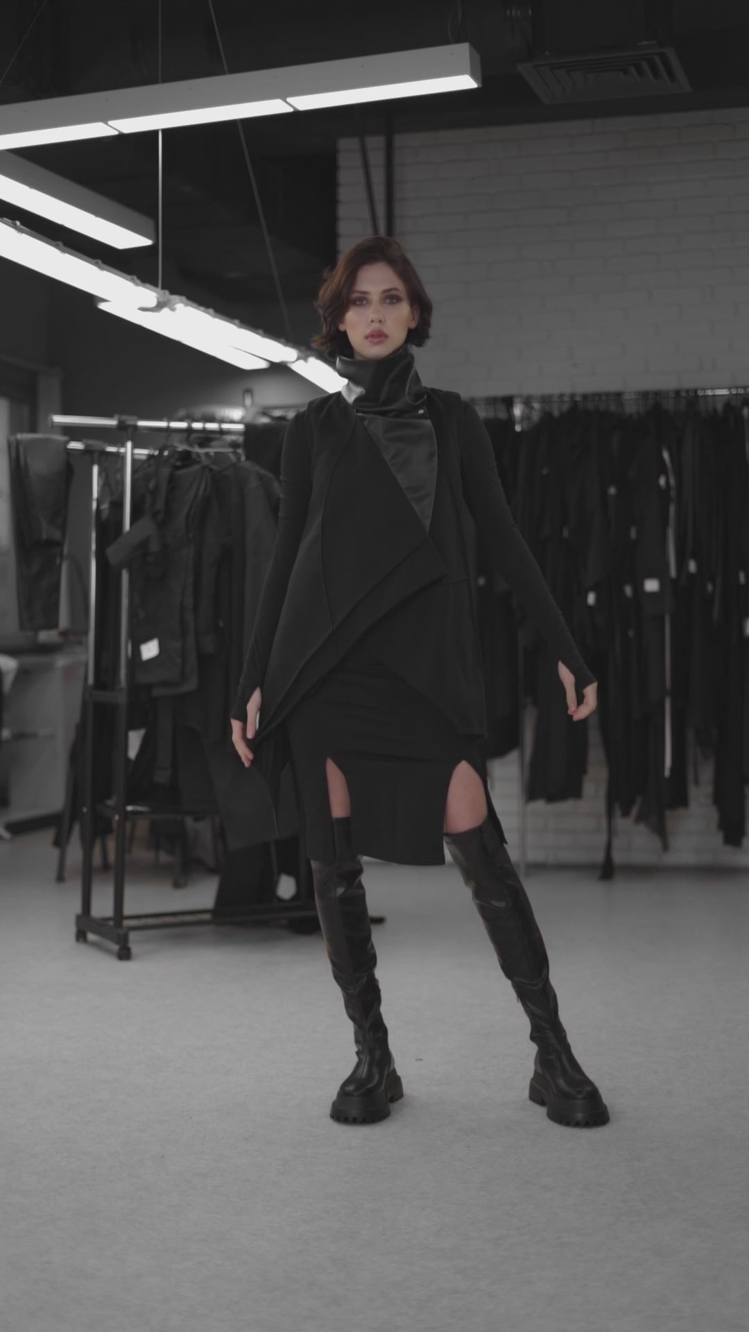 Gestural ruffles with asymmetrical cuts give this piece a unique wow factor while an exaggerated pintuck-decorated stand-up collar gives a firm appearance.