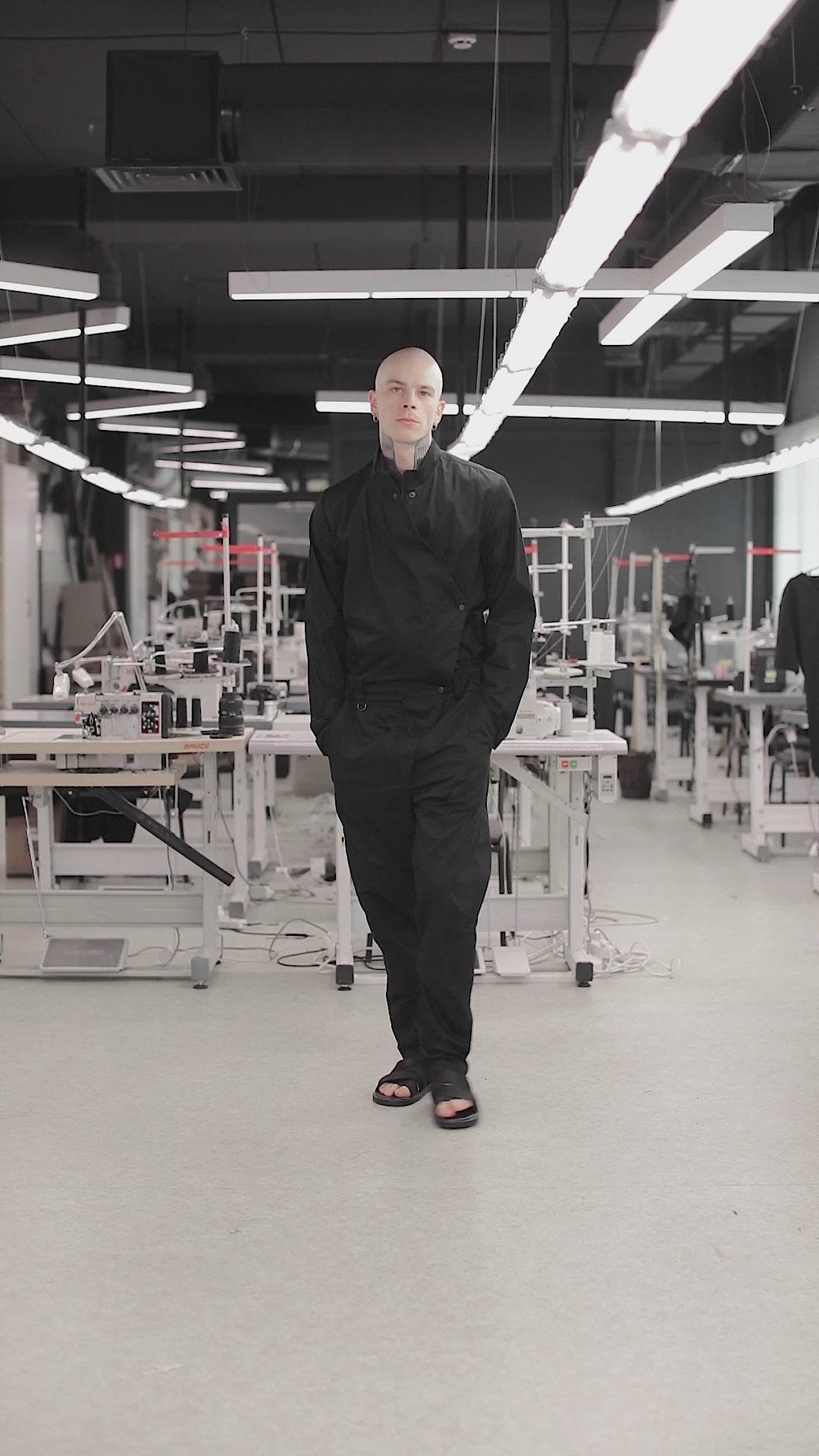 Zehat jumpsuit is here presented in a black edition and features a coverall loose design that is completed with masculine touches by utilizing geometric lines and muted hardware.